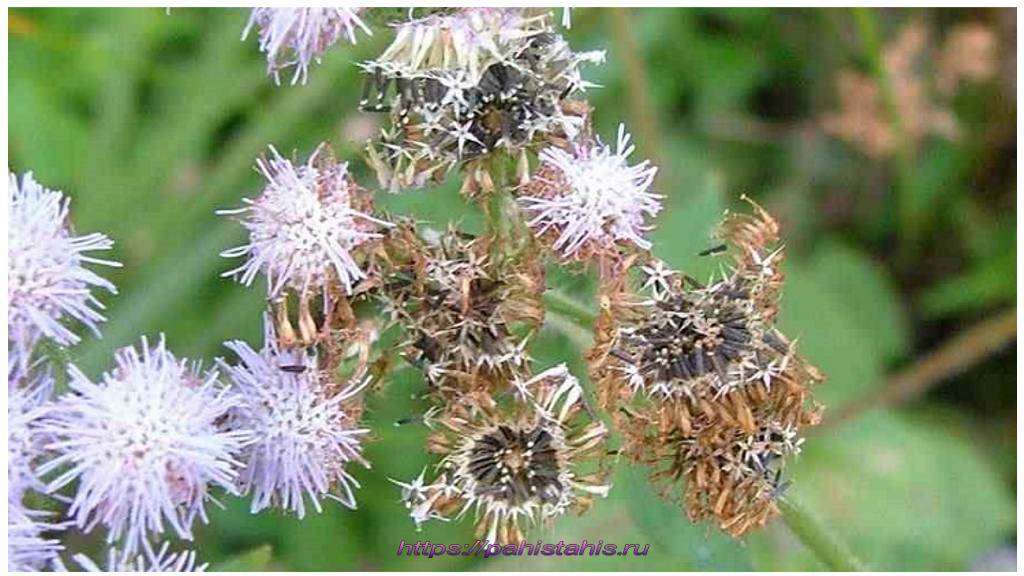 Агератум конизовидный (Ageratum conyzoides) – растение с широколанцетными с тупой верхушкой листьями, основание которых плавно переходит в черешок. Соцветия у этого вида небольшие и не очень привлекательные. Найти агератум конизовидный можно только в садах коллекционеров.