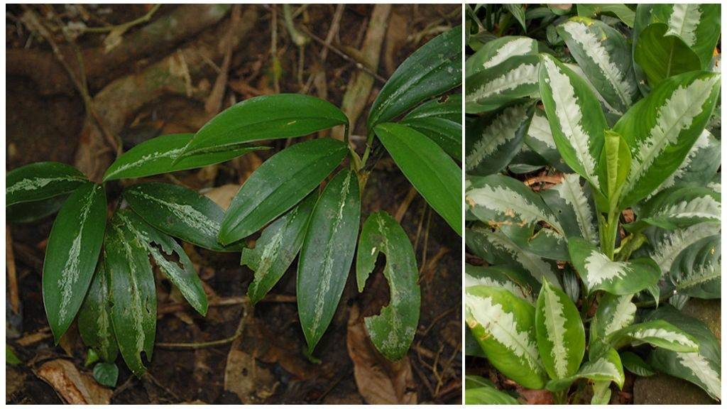 Также произрастает в тропических климатических поясах. Цветы распространены на островах Суматра и Борнео. Центральный стебель ветвится и достигает 0,6 м. Пластинки эллипсоидные, окрас зеленый, присутствуют серые пятна. Для определенных сортовых форм характерна серебристая пятнистость с белым оттенком. Плодоносит растение мелкими красными ягодками.