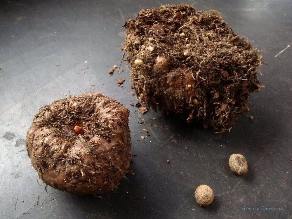Когда лист завянет, нужно осторожно выбить клубни из горшка, очистить их от почвы, внимательно осмотреть, отделить дочерние клубни. При необходимости удалить острым ножом гниющие участки и мертвые корни, после чего промыть ранки крепким раствором марганцовки и поместить клубни в сухое, темное и теплое место