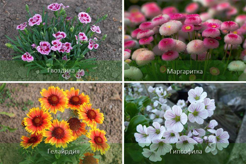 Среди низкорослых особенно популярны гипсофила, маргаритки, гвоздики, горечавки и гайлардии (есть и высокорослые сорта). Многолетние цветы можно использовать для создания сада, экономя время и деньги. Посадочный материал следует приобретать в специализированном магазине.