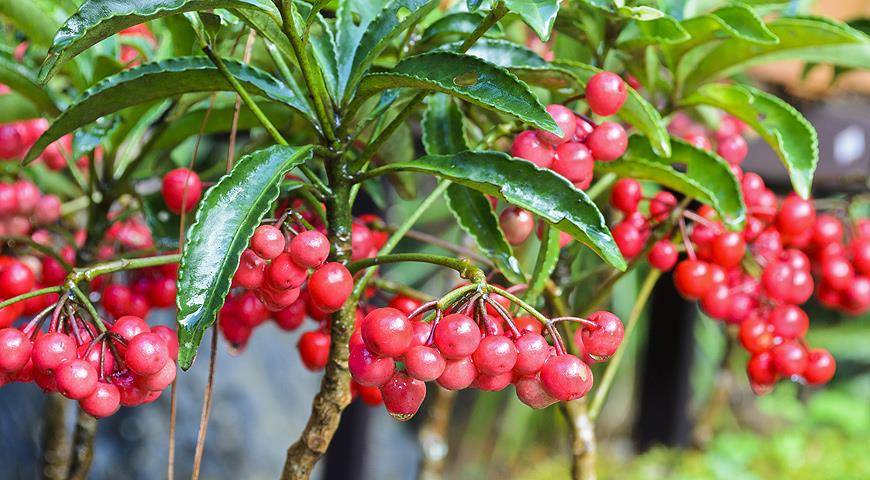Данный вид пользуется наибольшей популярностью у цветоводов. Куст отличается медленным ростом, а его высота не превышает 200 см. Глянцевые кожистые листовые пластины имеют волнистую кромку и темно-зеленый окрас. Вместо цветков, которые могут быть окрашены в розовый либо белый цвет, в зимнее время формируются кораллово-красные плоды. Плодоношение может длиться непрерывно в течение всего года.