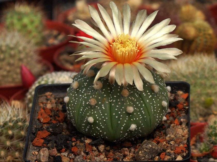 Пересадка и выбор почвы. Пересадки астрофитум очень не любит, поэтому горшок меняется в том случае, когда «шар» побега кактуса очень превосходит предоставленный ему горшок по диаметру или корневая система полностью освоила почву, находящуюся в горшке. Во время пересадки кактус необходимо присыпать новым субстратом на том же уровне, что и раньше, не допуская заглубления корневой шейки, иначе это приведет к скорому загниванию. Для того, чтобы избежать таких гнилостных процессов, стараются уменьшить контакт стебля астрофитума с почвой, для этого стебель слегка присыпают мелким керамзитом или галькой. Горшки для пересадки выбирают неглубокие и плоские, так как корневая система кактуса слабо развитая.