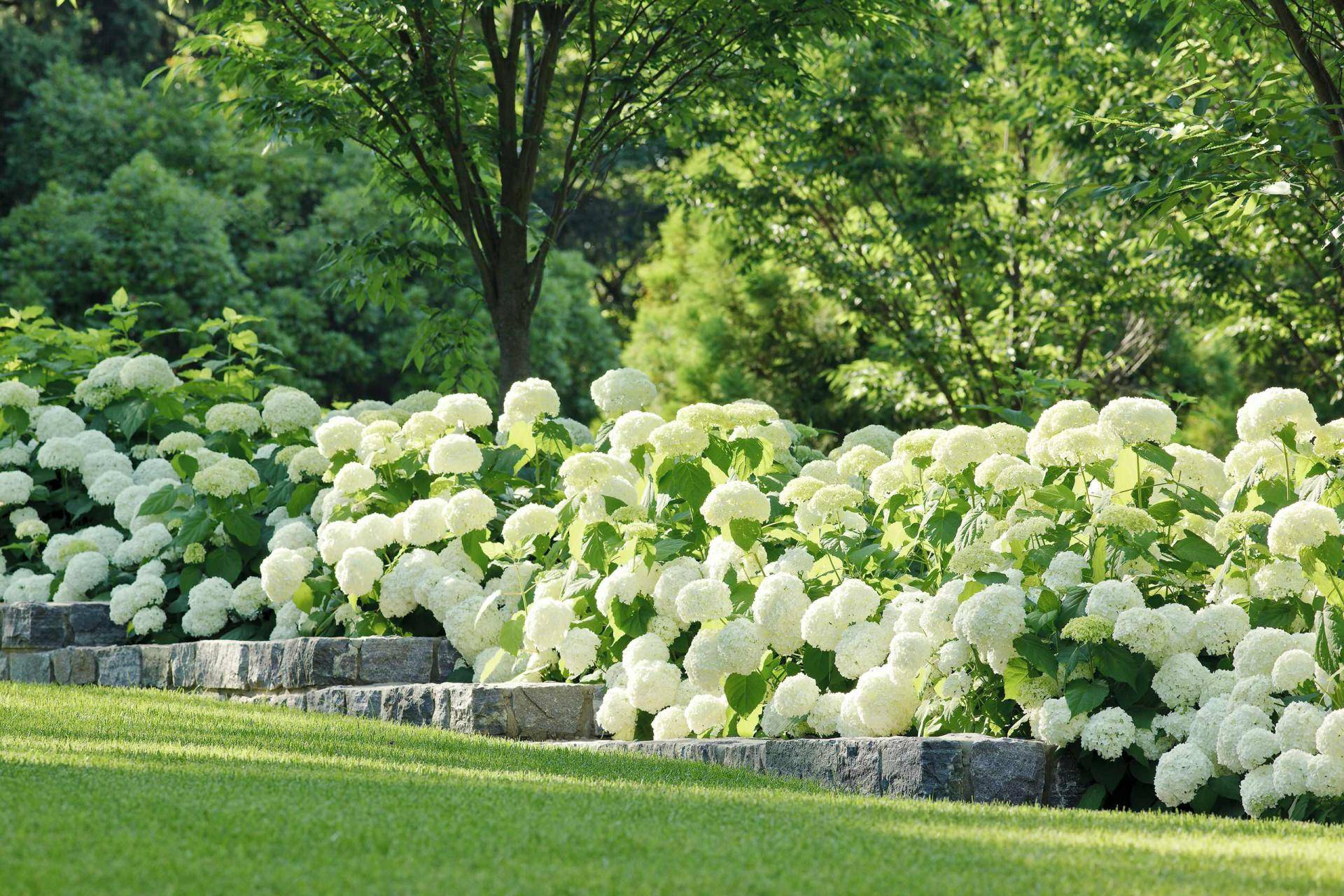 Наиболее часто в садах встречается гортензия древовидная. Это типичный кустарник с постоянно отрастающими от земли побегами, на концах которых образуются шаровидные соцветия. Сорта преимущественно белые, но выведен сорт с розовеющими к осени цветками (“Хилс оф Сноу”) и сорт с чисто-розовой окраской соцветий (“Инвинсибл Спирит”). Кусты сильно разрастаются и полегают под тяжестью соцветий.