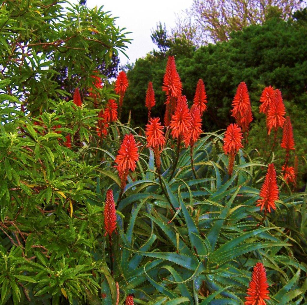 Цветущий в Южной Африке столетник выпускает несколько стрелок-цветоносов, длина которых достигает одного метра. Именно с них и появляется метёлка из бутонов – сначала полностью раскрываются те, что расположены внизу, а после их увядания распускаются верхние. Цветочки у алоэ мелкие и узкие, по форме – вытянутые, похожие на колокольчик. Каждый цветок состоит из 1 пестика и 6 тычинок. Окрас может быть разным – всё зависит от разновидности столетника. В домашних условиях могут появиться цветы белого, оранжевого, жёлтого или красного цвета. Цветущее алоэ напоминает свечку – цветы располагаются так, что основание метёлки всегда гораздо шире верхушки.