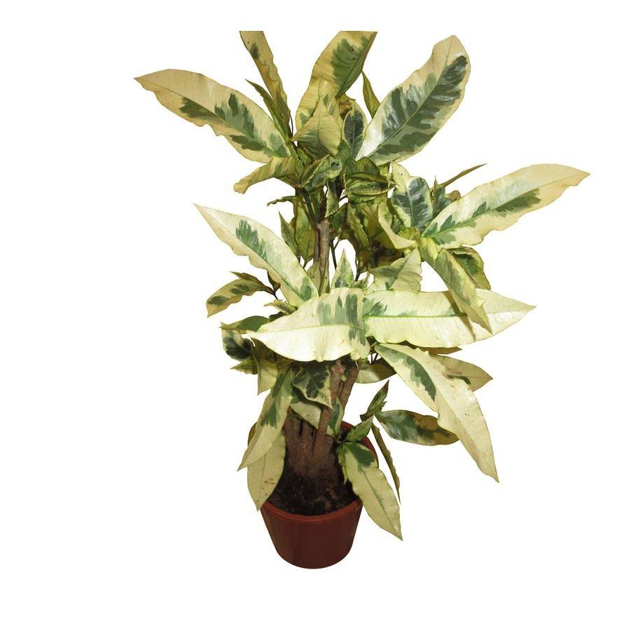 Codiaeum variegatum var. pi tum(Lodd.) Mull. Argued. Раскидистое дерево до 3 м. Ствол оголенный к низу. Короткочерешковые листья. В основании лист имеет яйцевидную форму. Коричнево — зеленый окрас. Родина — Пакистан, Китай, Тайвань.