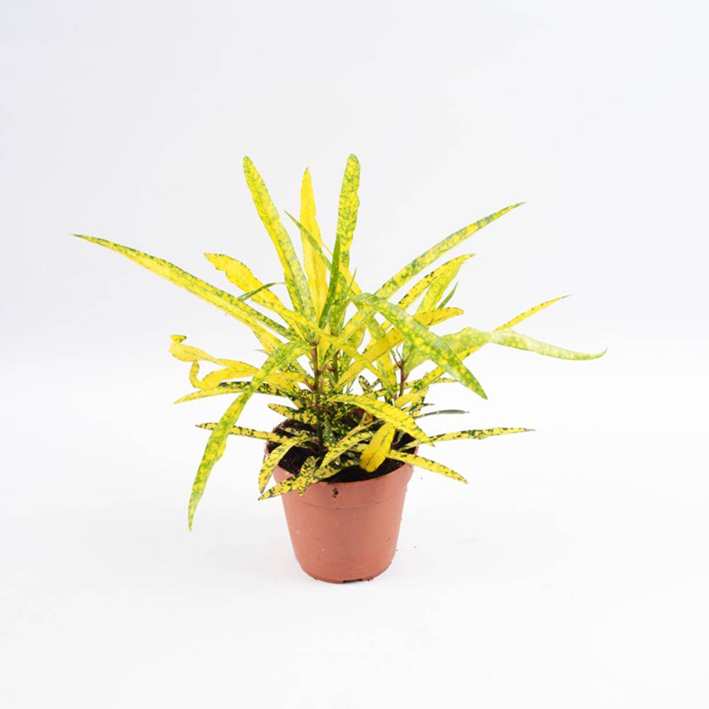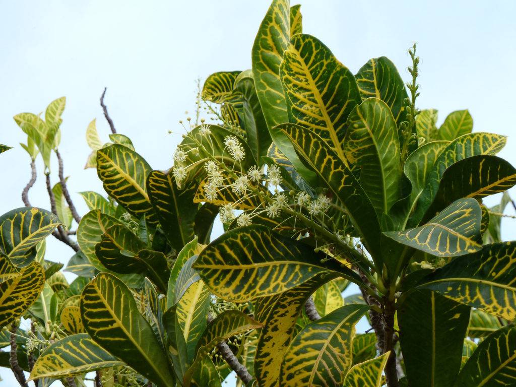 Листья кротона узколистного шириной до 1 см, длиной 25 см. С возрастом закручиваются к ветке, на которой растут, напоминая шар. При хорошем уходе цветок кротон узколистный становится пышным и разноцветным. На листовых пластинках могут появиться декоративные пятна желтого цвета.