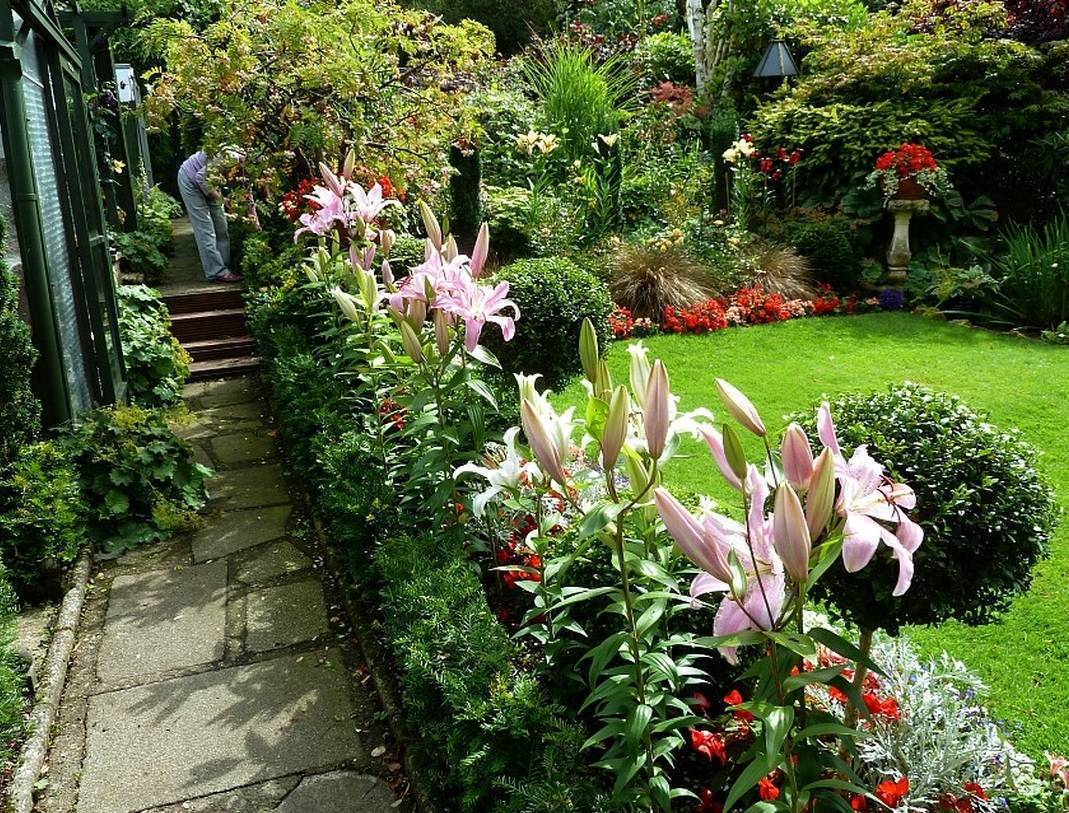 Вполне допускаются и даже приветствуются комбинации из цветов разных групп или разных сортов. Например, их можно посадить в несколько ярусов. Многоуровневые композиции смотрятся в саду впечатляюще. Впереди при этом высаживаются низкорослые виды, сзади – азиатские или ЛА-гибриды, следом – высокорослые сорта или ОТ-гибриды. Очень эстетично будет выглядеть такой цветник, если цветение будет происходить по нарастающей – начиная с нижнего уровня.