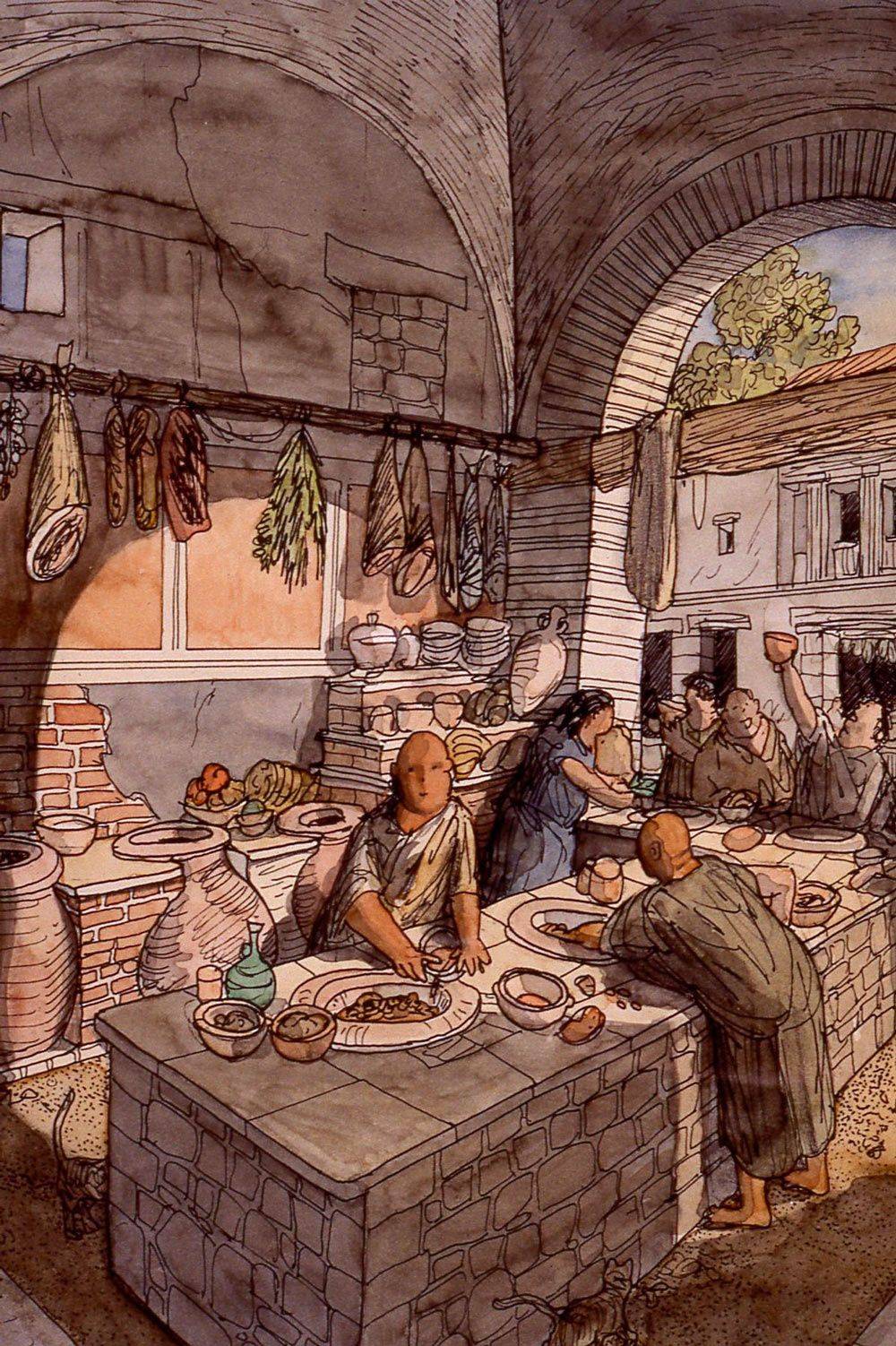 Почти весь Рим был довольно опасным и гнусным местом. Простые горожане балансировали между нищетой и бедностью и жили в переполненных многоэтажных домах (в общем, почти как мы с вами). В таком жилье даже не было своих кухонь, так что римляне вынуждены были питаться фастфудом. Днем они ходили в термопилии — забегаловки с кашами, дешевым вином, сыром, а также подобием бургеров и пиццы. Там простой трудяга быстро, прямо на ходу, перекусывал, выпивал, иногда подцеплял проститутку, которую вел в ближайший переулок — в общем, проводил обеденный перерыв как позволяли финансы. А вот ужинали уже в другом заведении — трактирах, именуемых каупонами.
