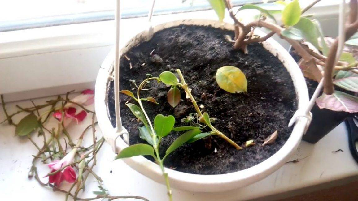 Чтобы укоренить, черенки помещают в маленькие стаканчики, наполненные влажной почвой. В состав субстрата должны входить песок и торф в одинаковых пропорциях. Если будет возможность, в одной части к общему объему добавьте сухой сфангум. Во время посадки на укоренение, черенок помещают в почву не глубже, чем за край первой пары листьев. После, поместите емкость с дипладенией в мини-теплицу. Основное условие такого места — постоянный, очень теплый климат, температура не должна опускаться ниже 25 градусов тепла. В период становления полив лучше осуществлять через поддон. В основном, уже через 30 дней у черенков появляется собственное корневище. Как только вы заметите появление пусть даже самой примитивной, но корневой системы, пересаживайте черенки в постоянные горшки. В основном, цветоводы предпочитают укоренять черенки мандевиллы в обычных стаканах с водой, а когда они достигают в высоту около 2-х сантиметров, пересаживают в постоянные горшки с оптимальной для развития почвой.