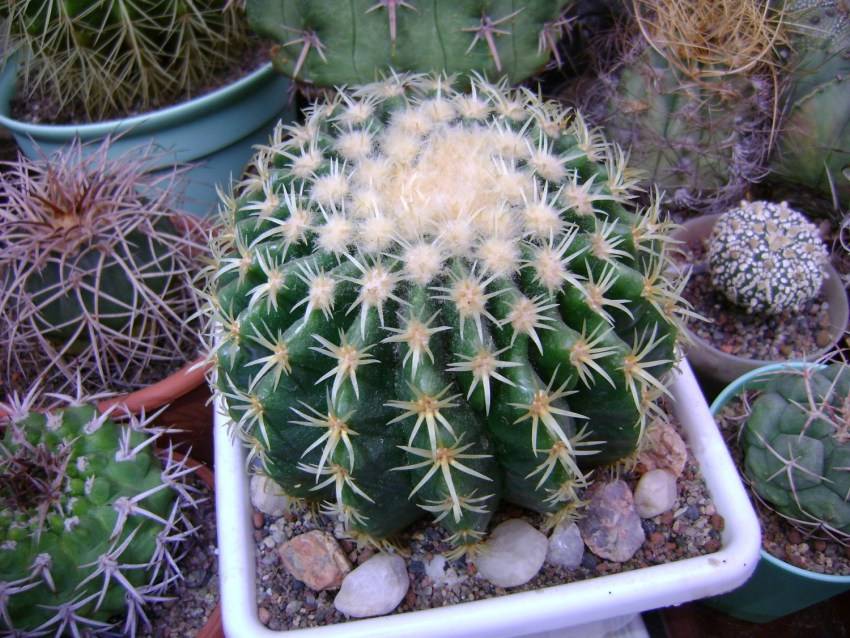 - Эхинокактус полицефалус. Колючки желтоватые, могут иметь красноватый оттенок, до 5 см в длину. Цветки средние, желтой окраски.