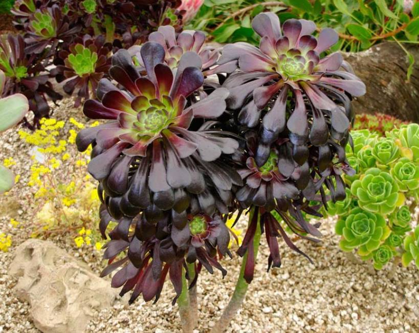 - Эониум Шварцкопф (A. arboreum ‘Schwartzkopf’) – лидер в рейтинге популярности. Самый эффектный в списке ‘Schwartzkopf’ выведен на основе эониума древовидного ещё в конце 19 века в Европе, где его называли Черная роза. Сорт известен рядом искусственных мутаций, давших новые культивары, отличающиеся лишь по оттеночному тону розетки.