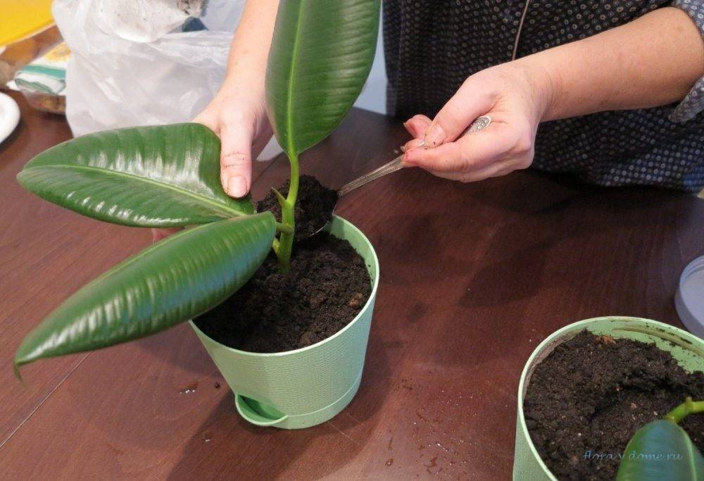 Пересаживают каучуконосный фикус в грунт, состоящий из одинаковых пропорций торфа, песка, дерновой и листовой земли. Использование метода переваливания в данном случае наиболее приемлемо. Предварительно увлажненный цветок вынимают вместе с земляным комом из старого сосуда и помещают в новый, а свободное пространство заполняют свежей почвосмесью.