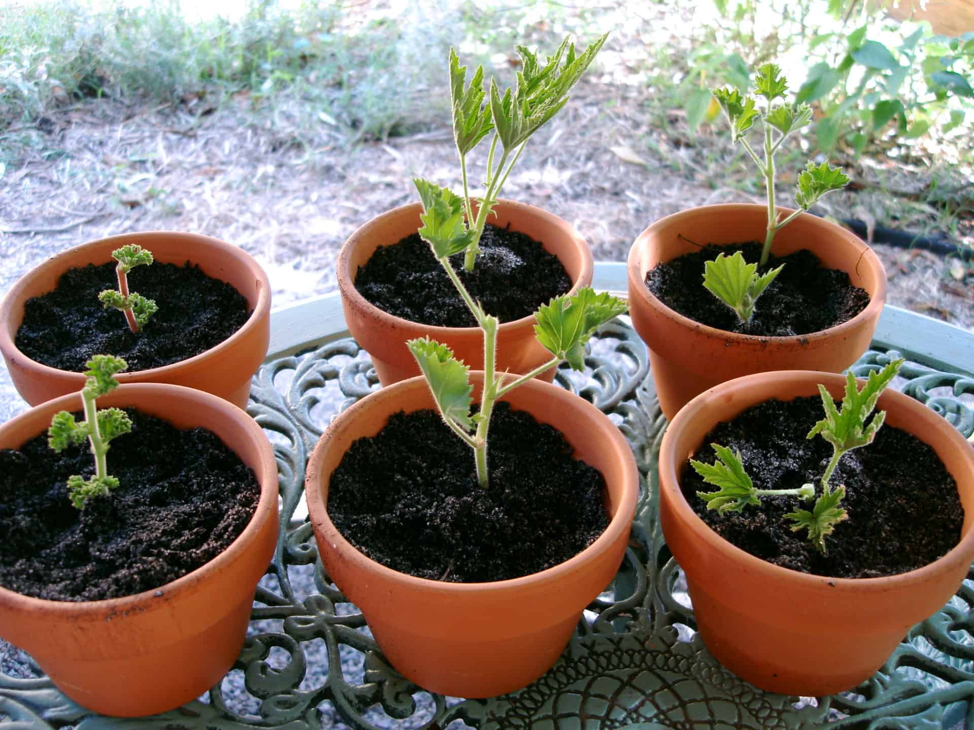 С появлением ростков укрытие начинают постепенно приоткрывать, ежедневно увеличивая время проветривания. Когда сеянцы образуют 2-3 листа, плёнку снимают совсем, а молодые пеларгонии пикируют по собственным горшкам (не более 10 см диаметром и до 14 см глубиной). На дно ёмкости обязательно закладывают дренажный слой. Через пару недель после пикировки проводят подкормку. Когда кустики достигнут высоты в 15 см, их необходимо прищипнуть для стимуляции роста боковых побегов.