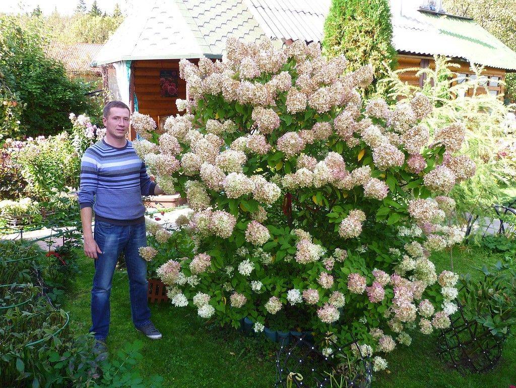 Кустарник, вырастающий в высоту на 2 – 2,5 м. Соцветия имеют очень декоративный вид: они широкие и плотные, а также крупные. Начинается цветение в белом оттенке, затем начинают розоветь снизу.