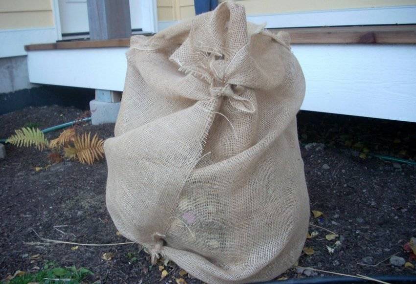 Когда подготовительные процедуры проведены, можно приступать к оформлению укрытия. Обычно это делают в сентябре. Под кустом укладывают деревянную доску или рубероид. Побеги нужно собрать в охапку и наклонить как можно ниже к земле, пригнуть к подстилке и зафиксировать. Поверх укладывается слой защитного материала, в качестве такового подойдёт обычная мешковина. Поверх него насыпают слой опилок, а сверху — полиэтилен. В клеёнчатой основе лучше сделать дырки, чтобы обеспечить проникновение воздуха в осенний период. С наступлением морозов полиэтилен накрывают лапником.