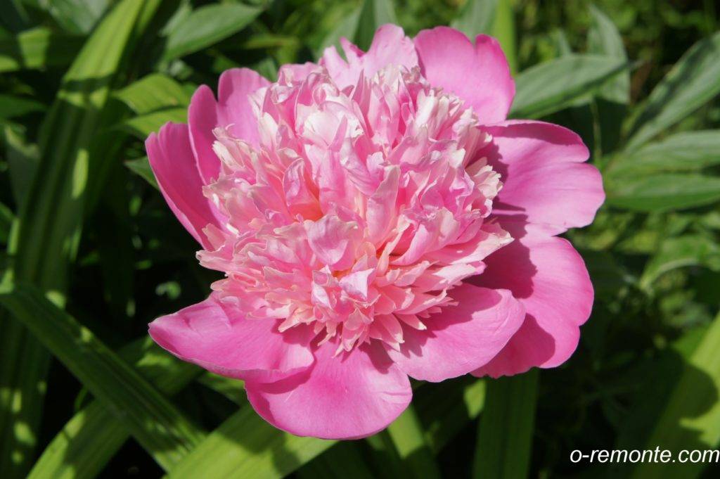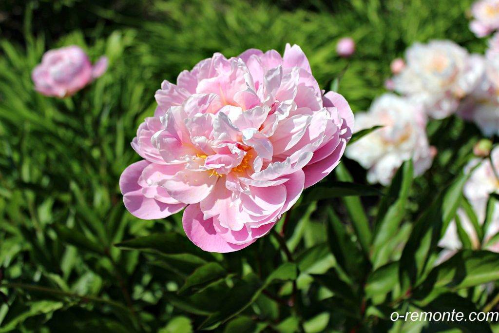 Пион Сара Бернар среднепоздний, цветут до середины июля. Шапка цветка округлая, компактная – до 20 см в диаметре, располагается на крепком стебле.