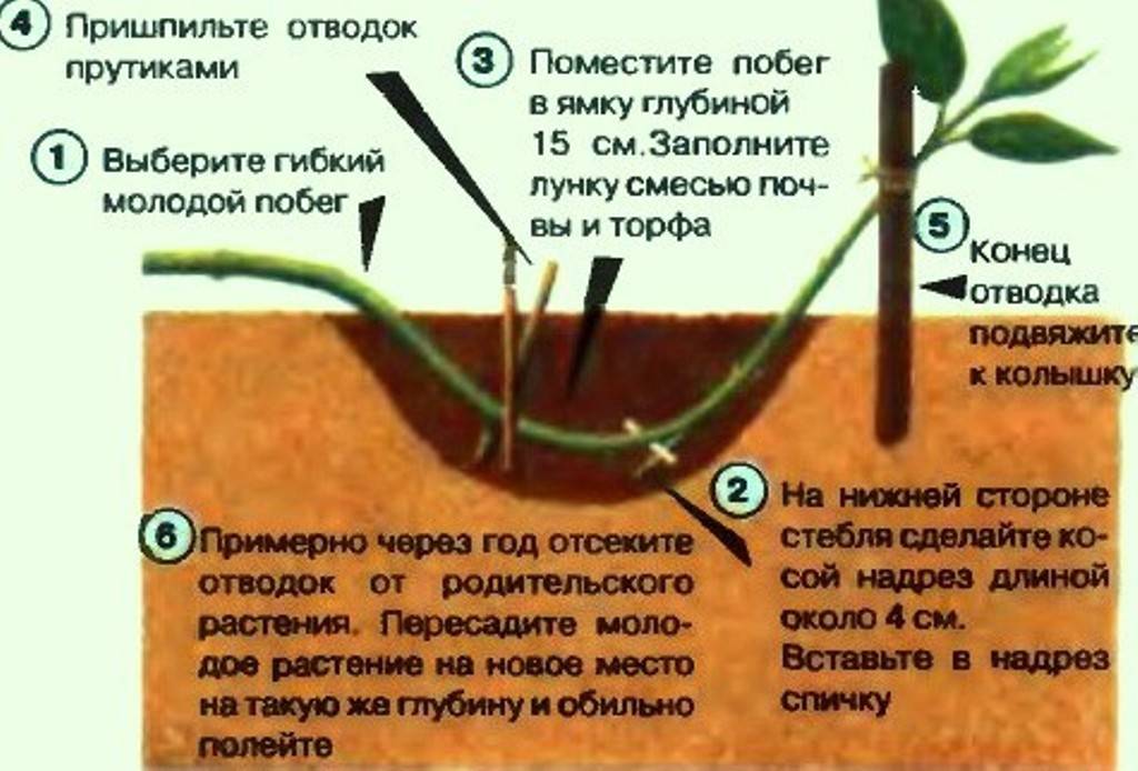 Разросшиеся взрослые кусты (от 5-ти лет) можно размножить отводками. Делать это нужно в период начальной стадии вегетации (май-июнь). Для этого стоит выбрать здоровый, длинный побег и пришить его к земле скобой или шпилькой.