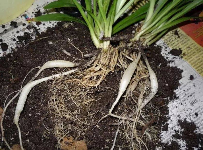 - Бережно вытащите. Очистите корни от земли, можно промыть водой, но необязательно. Если горшок стал хлорофитуму мал, то его корни будут слегка искривленными, под форму горшка. Если это так – очень бережно потяните их вниз, чтобы распрямились.