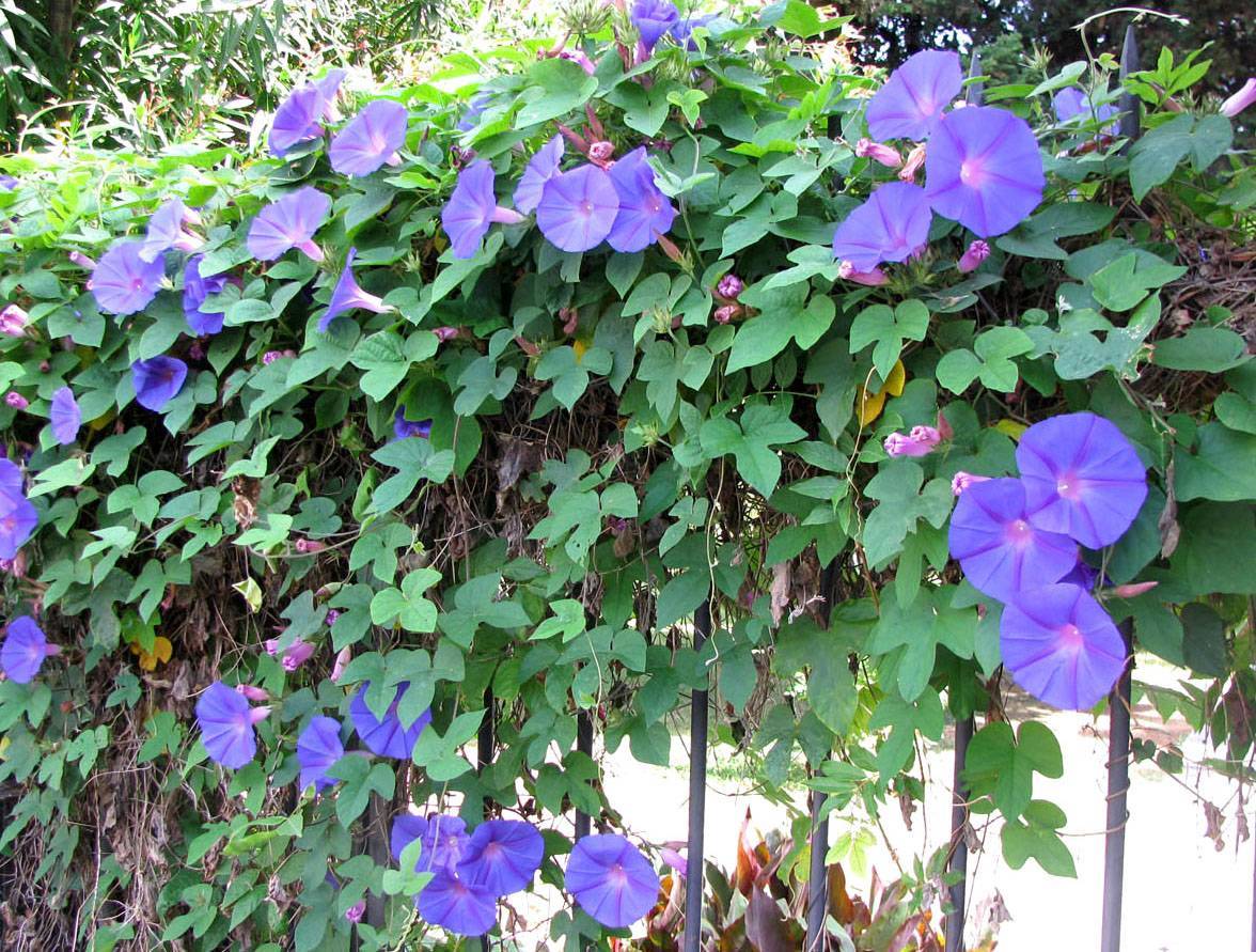 Ипомея пурпурная — вырастает до 3 м, листва зелёная ланцетная. Цветки диаметром 8 см голубого, розового, лилового, белого оттенков. Сорта: Морская звезда, Скарлетт О̕ Хара, Жизель.