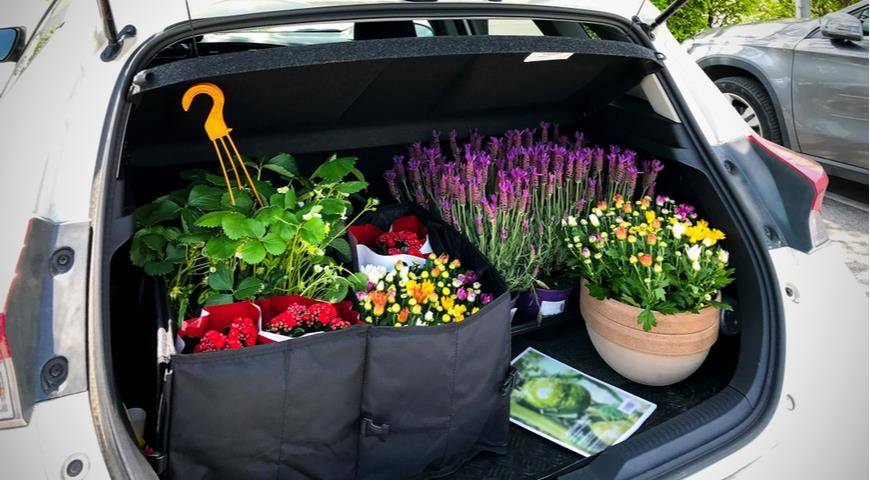 Отправляясь за покупками растений, выстелите багажник пленкой (ненужной скатертью, мешковиной, любым подручным материалом) и поставьте крупные пластиковые контейнеры, в которые можно будет поставить растения и не бояться, что они повалятся и помнутся.
