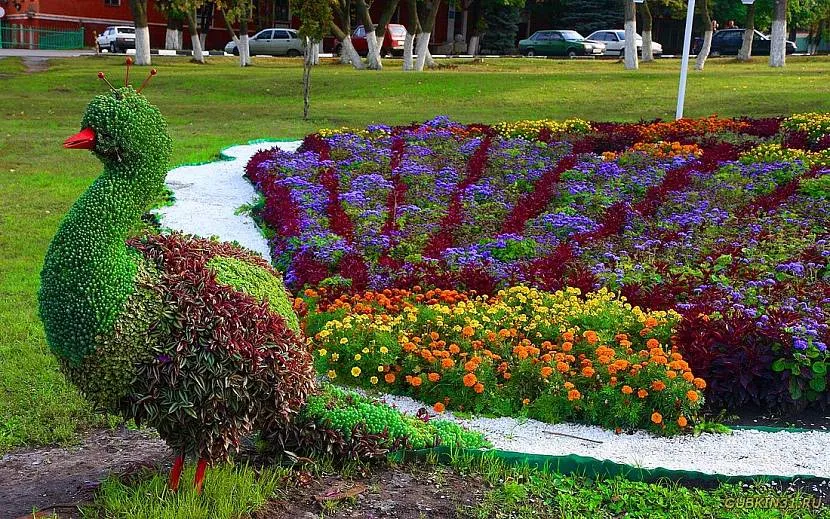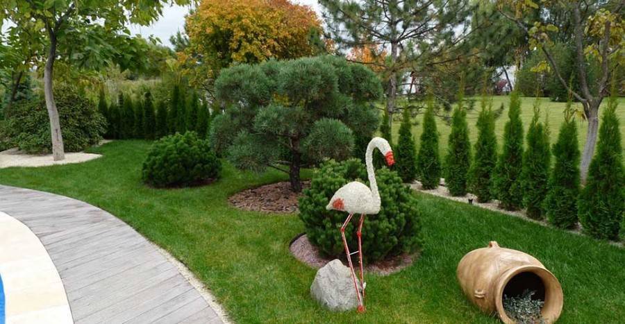 Оригинально смотрятся садовые фигуры, разные валуны и предметы декора. На газоне большого размера можно разбить арабеску, оформив ее в виде жар-птицы
