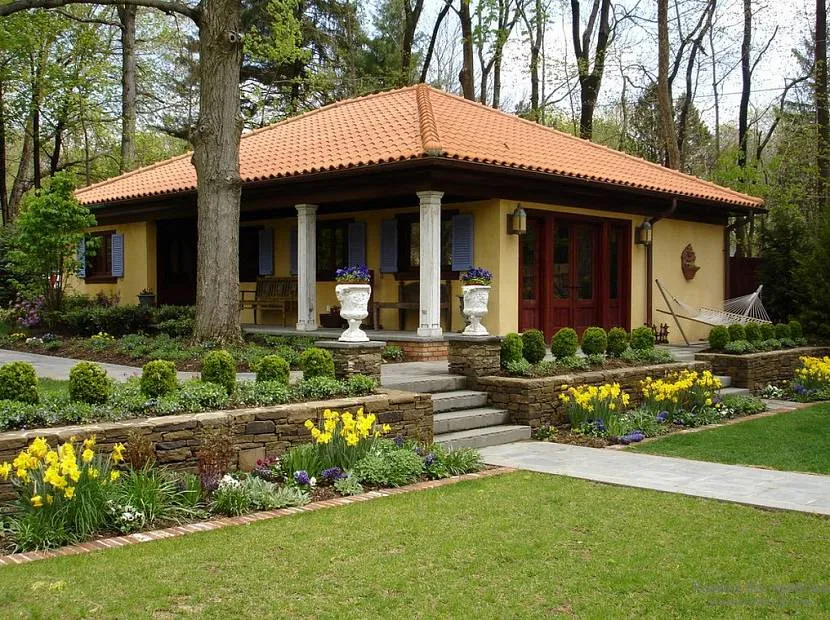 Если уменьшить количество растений возле дома, будет упрощен уход за территорией. Для сезонной высадки цветов можно использовать вазоны