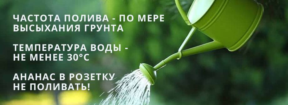 Помните, что ананас в природе привык к тропическому климату, а значит, он умеет переносить жару. Ему приходится обходиться без воды по нескольку месяцев. Поэтому главная ошибка, которую вы можете совершить, — это переусердствовать с обильным поливом. Лучший совет: следите за своим растением, почувствуйте его. Достаточно поливать ананас пару раз в неделю, а в зимнее время и того реже. Если же вашему растению понадобится больше влаги, об этом скажут засыхающие листья. Тогда поливать потребуется более часто или обильно. Но избыток влаги может привести к загниванию и гибели.