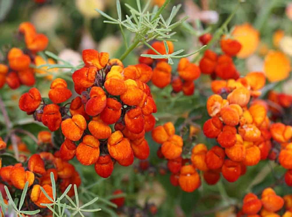 Период цветения чаще всего приходится на май-сентябрь, но продолжительность его и начало в значительной степени зависят от сроков посева семян и условий содержания. Здоровый куст в прохладном помещении имеет шикарный вид и нежный аромат. Цветы у разных видов отличаются формой и расцветкой, но чаще всего это двугубый венчик и 2-3 тычинки в четырехчленной чашечке. Верхняя губа — мелкая шаровидная, нижняя — крупная надутая. Необычная форма напоминает раскрытую сумочку или оригинальный башмачок. Количество цветов в соцветии и длина цветоносов тоже отличаются. Один куст может иметь от 30 до 50 цветков. В результате оплодотворения появляются семенные коробочки с большим количеством очень мелких семян.