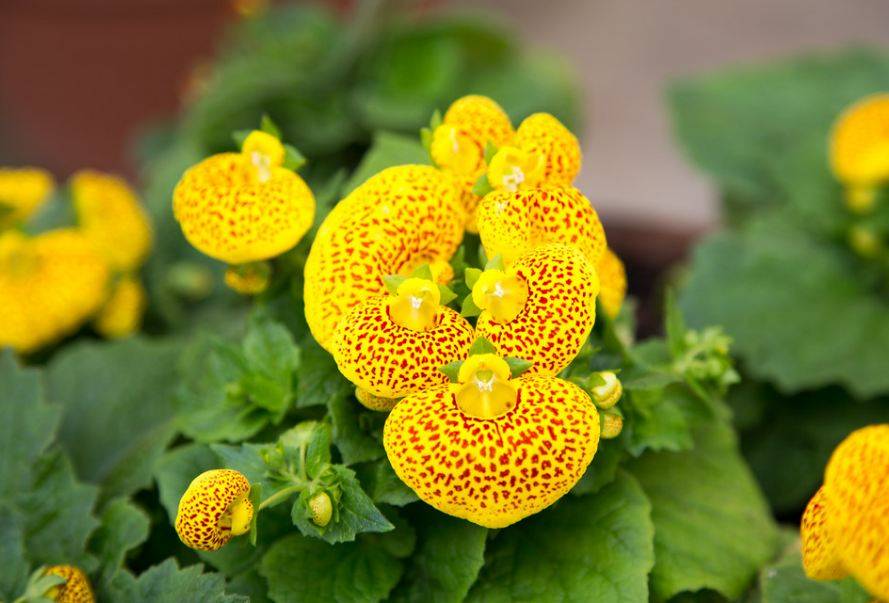 Это красивоцветущее растение порадует вас своими цветочками в весеннее время, при этом стоит знать, что в домашних условиях растить его проблематично, так как оно предпочитает прохладные места. Особо выделяются его шаровидные, яркие, пузырчатые цветки. Зачастую на цветочках имеется множество разных точек и пятен. Как правило, цветет кальцеолярия с марта месяца и по июнь. Цветение же продолжается в течение 4 недель. На одном растении может образоваться 18–55 цветочков.