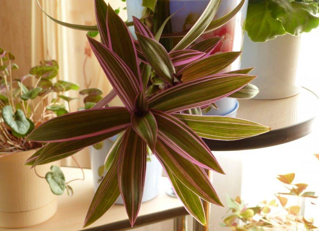 Традесканция триколор или разноцветная совмещает три оттенка в листовых пластинах – зеленый, белый с розовым отливом, ярко-розовый с обратной стороны листа. Это очень красивое растение, но требует постоянного источника света. Зимой для него желательно организовать подсветку фитолампой.
