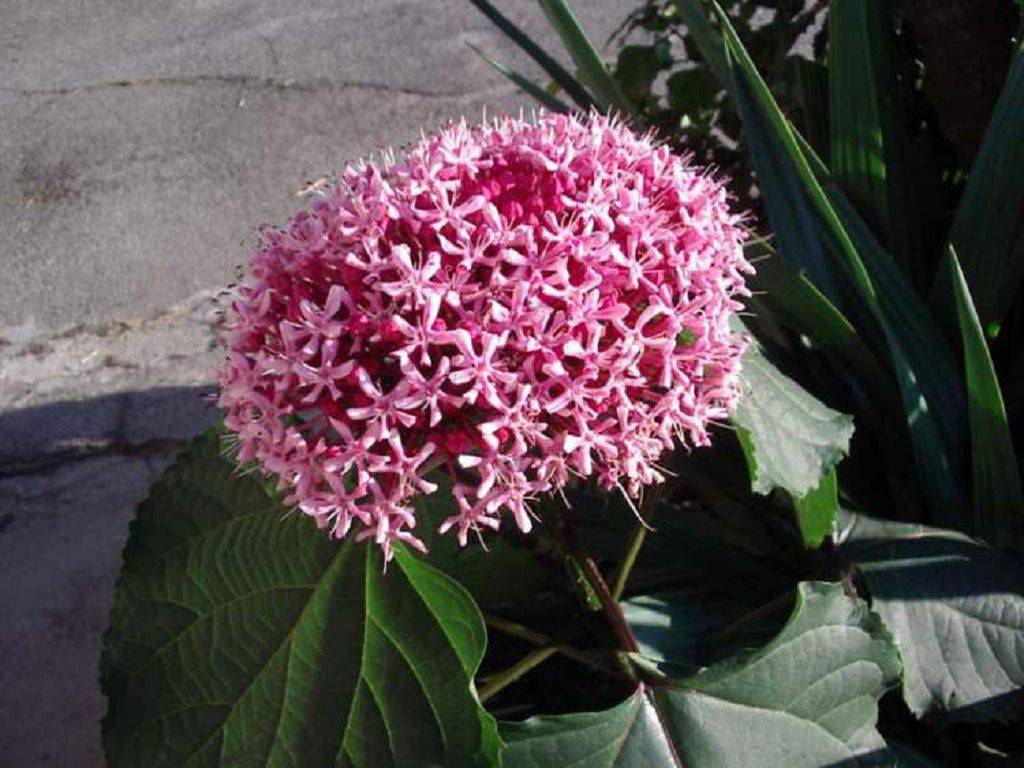 Клеродендрум Бунге имеет форму кустарника, по внешнему виду цветы напоминают цветение гортензии розового оттенка.