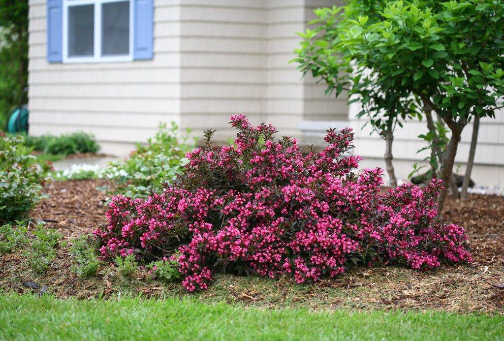 Декорирование участка одиночным кустом вейгелы свободной формы