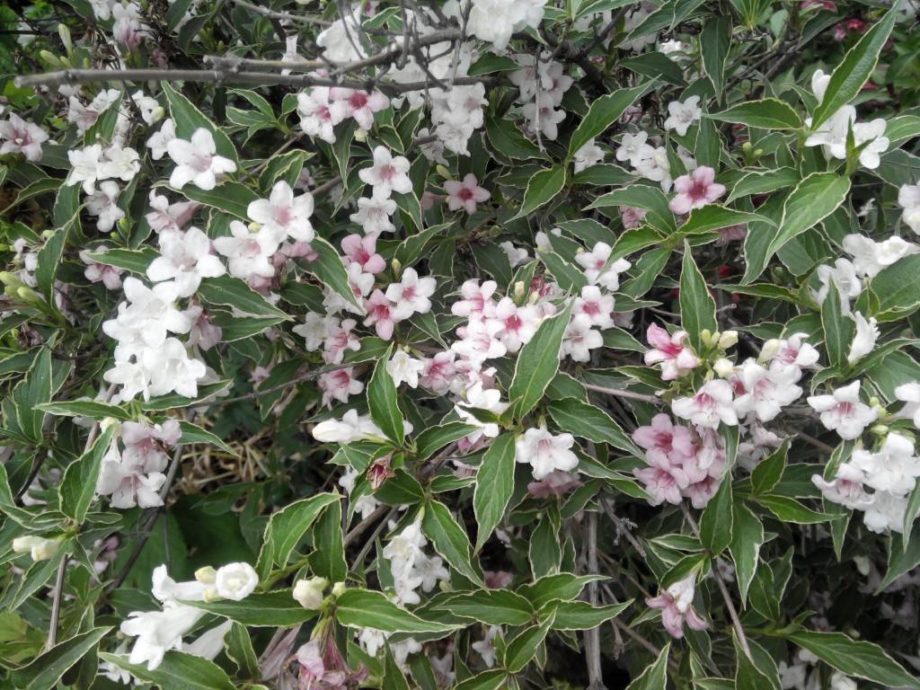 Цветки этого вида окрашены в розово-белые цвета. А пышная зелень с белой окантовкой по краям добавляют растению еще больше очарования. Побеги вейгелы по мере роста меняют свой цвет с красновато-розового на серо-коричневый.