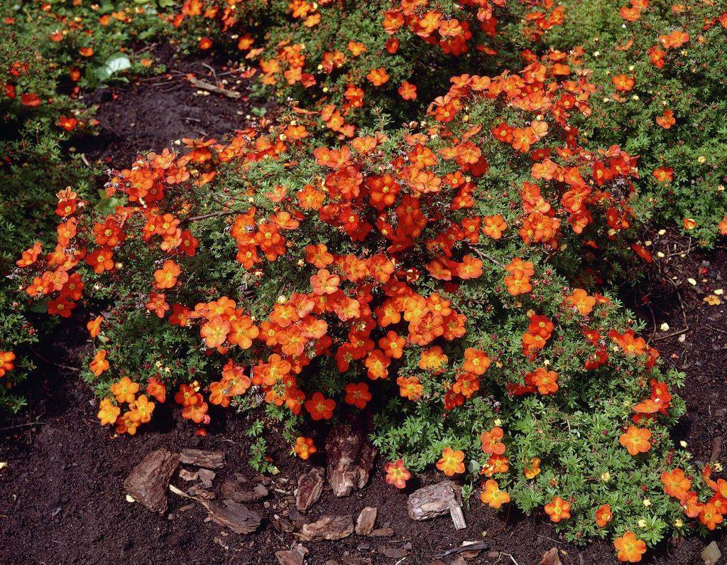 Лапчатка кустарниковая “Хопли Оранж” (‘Hopley Orange’) – кустарник высотой 50 см, ширина кроны около 1 м. Ее цветки темно-оранжевые.