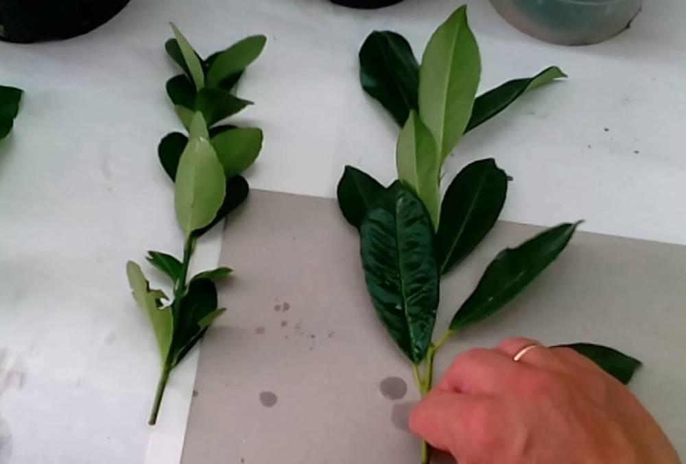 Для черенкования используются побеги после обрезки растения. Процедура проводится в начале весны. Заготовки должны иметь 2-3 почки. Побег срезают под углом 45 градусов, затем нижние листья удаляют. Верхние листочки обрезают на половину длины. Нижний срез черенка обрабатывают стимулятором корнеобразования. Подготовленный таким образом черенок помещают во влажный песок, перлит или вермикулит.