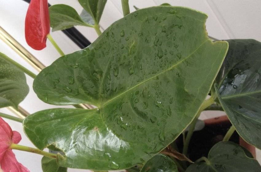 Антуриум чувствителен к сквознякам — из-за них листки растения покрываются бурыми пятнами, которые затем чернеют, а цветок увядает.