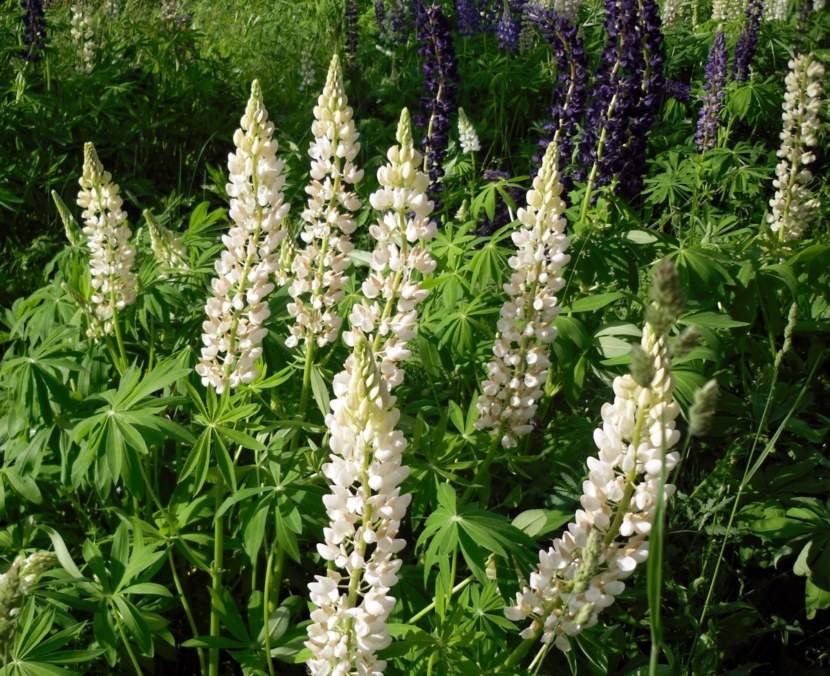 Люпин белый самый популярный среди однолетников. Вырастает до 2 м в высоту. Отличается устойчивостью к жаре и засухам. К недостаткам относят требовательность к почве. Люпин синий (узколистый) цветет сине-фиолетовым, белым или розовым. К преимуществам сорта относят холодоустойчивость и скороспелость. Подходит для северных районов.