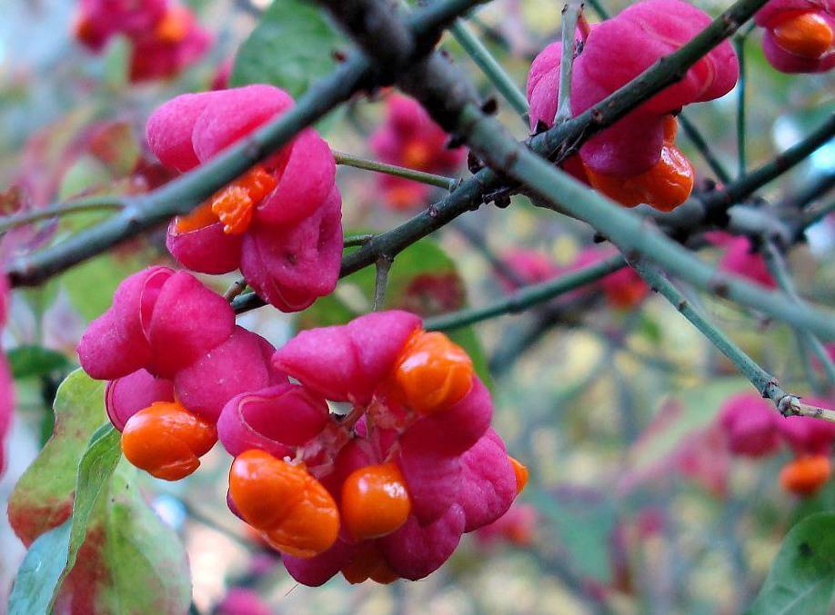 - бересклет европейский, представляет невысокое дерево или куст, осенью пурпурный с оранжевыми серёжками плодов;