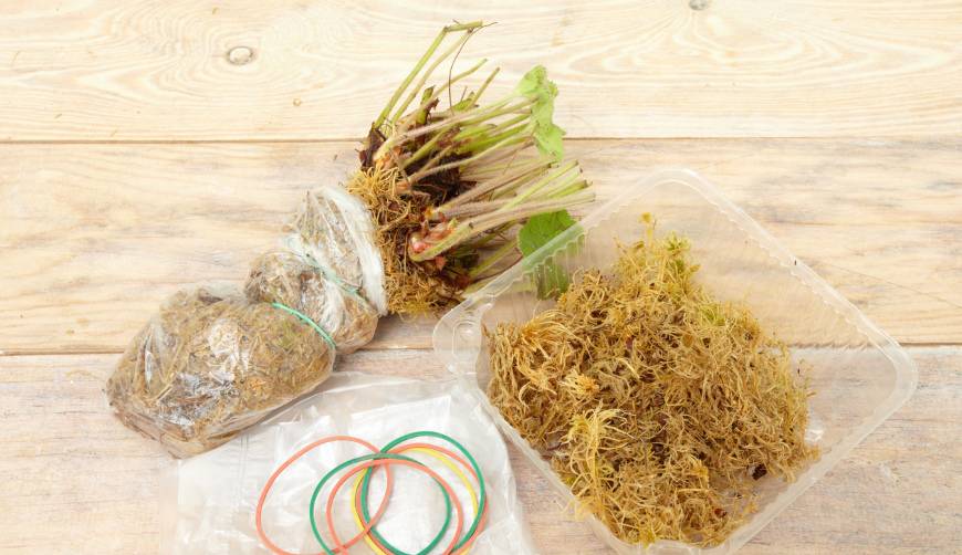 - Укоренение черенков. Укоренять во мхе можно срезанные черенки (например, листики фиалок). А можно обвязывать растения с толстыми стеблями без нижних листьев пленкой с влажным сфагнумом (на стебле предварительно делают надрез). Этот способ применяется и для черенкования роз.