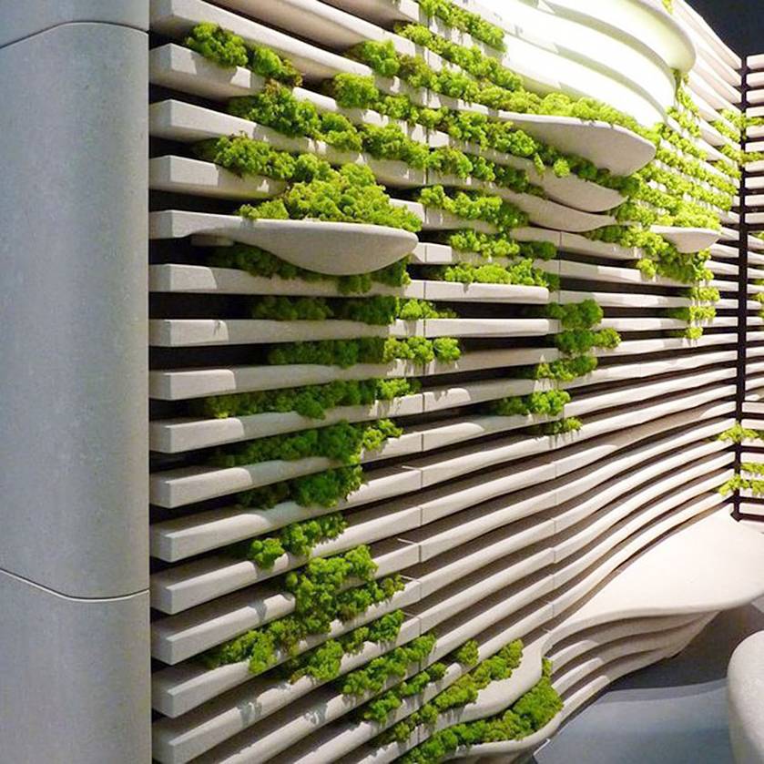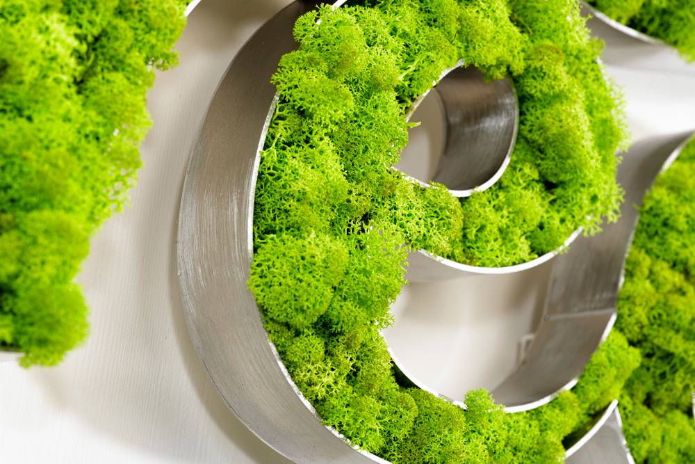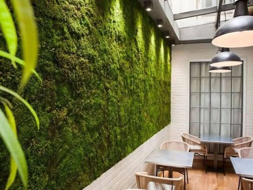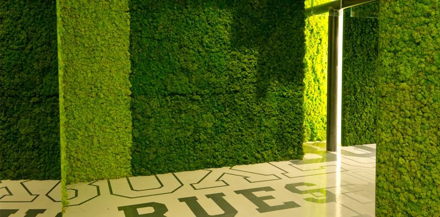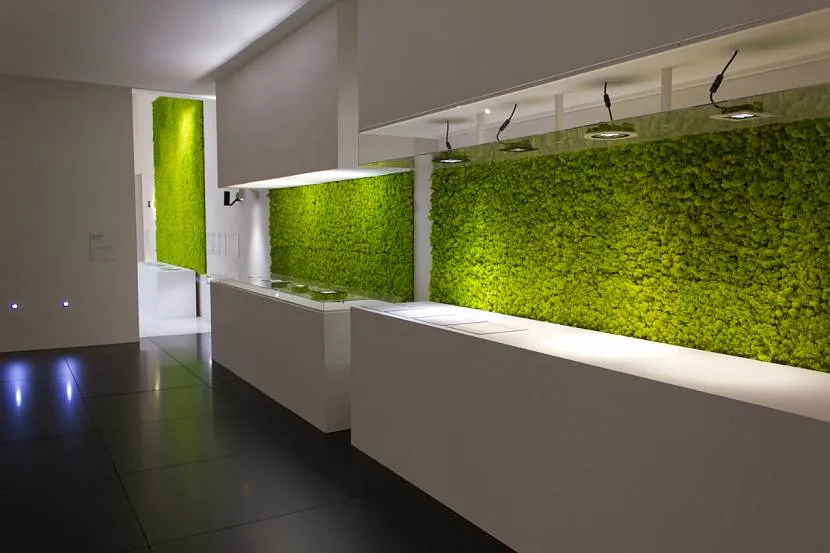 Фитостены. Трендовый вид озеленения, когда поверхность стены полностью оклеивается зеленым ковром. Декор выгоден там, где слишком темно для живых растений. Для усиления эффекта мох дополняется другими стабилизированными растениями, подсветкой.