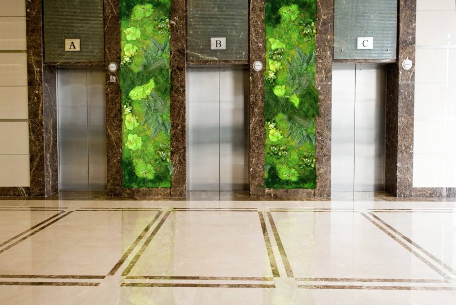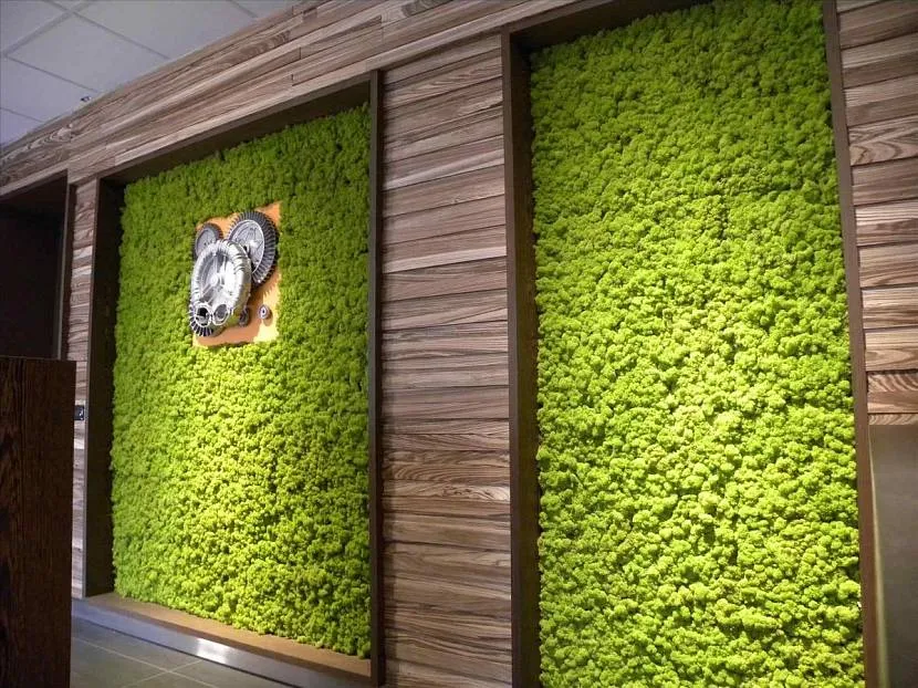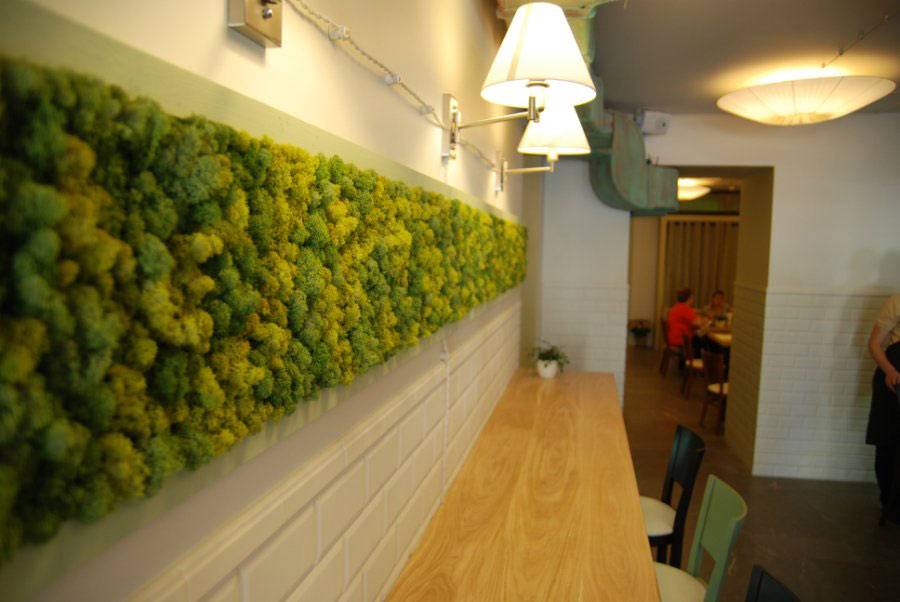 Смелая идея норвежцев была принята с энтузиазмом и вскоре стала активно использоваться, модифицируясь во всевозможные варианты. Наиболее оригинальное, смелое и эффектное применение мха в интерьере — это обустройство так называемых вертикальных садов, «живых» картин или фитостен. Такие формы флористического декора не новы, но использование в них мха дает немало плюсов: нет необходимости в поливе, удобрении, стрижке. Также не нужно выстраивать тяжелую конструкцию с грунтом.