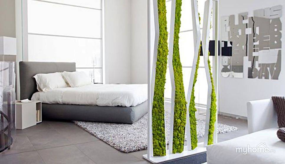 В комнате для сна и отдыха красиво смотрятся зеленые панели с подсветкой вверху и выступами внизу, а также стилизованные ниши. Фитовставками можно оформить зону туалетного столика либо отделать рабочий стол, если он установлен в спальне. Также хорошим вариантом станет обрамление зеленью телевизора, монтаж небольших моховых картин, окружение спинки кровати, выхода на балкон, оконного проема.