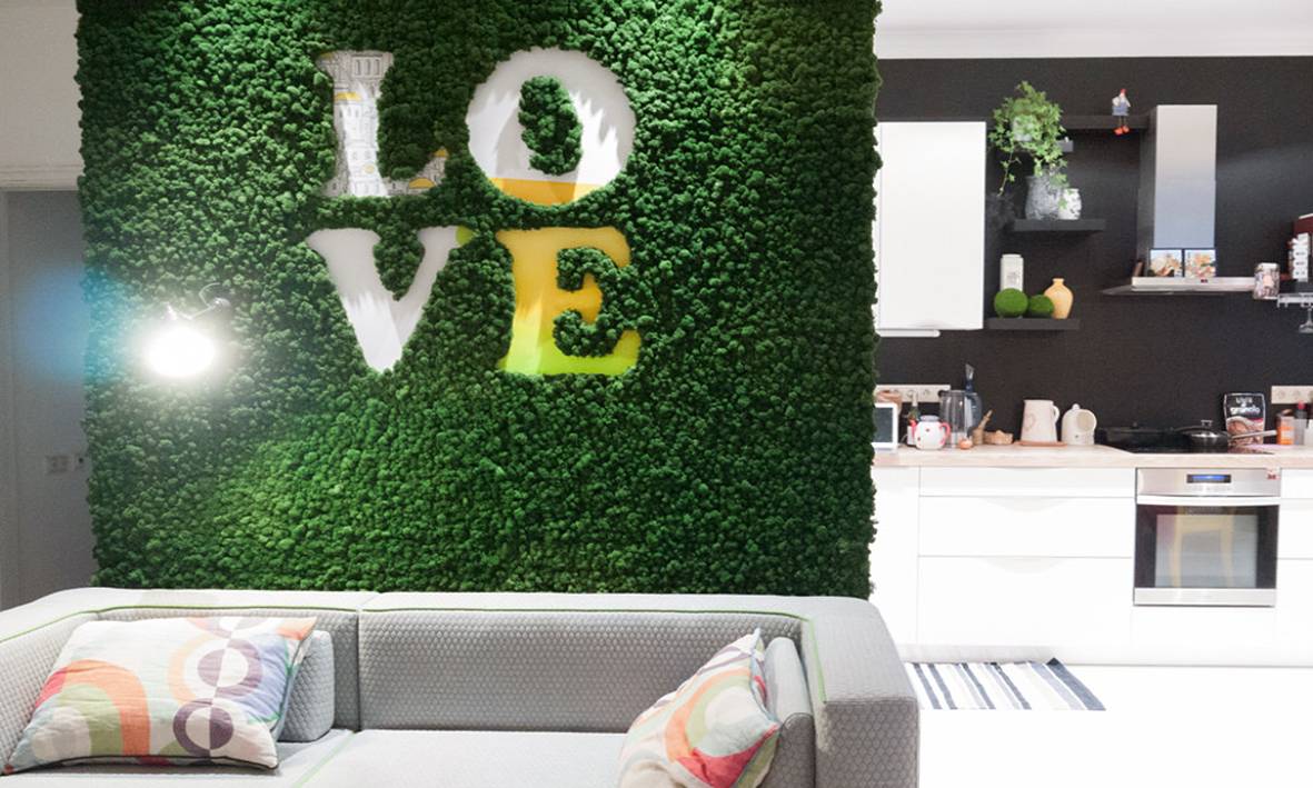 В современном дизайне интерьера все чаще появляются картины и надписи из мха. Это современный подход оформления, который способен вывести на новый уровень картины и декоративное пано из стандартных рамок понимания.При помощи декоративного мха можно напрямую преобразить саму поверхность стен в интерьере. При создании произведений из мха и при непосредственном декорировании стен, используются различные цветовые гаммы.Стабилизированный мох может озеленить любое помещение, придать ему свой стиль, а главное – мох абсолютно безвреден для здоровья человека и домашних животных. Во влаге стабилизированный мох почти не нуждается, необходимо иногда промакивать влажной щеткой для уборки пыли. Щетка должна иметь мягкий ворс, который не испортит поверхность декоративного мха.Сегодня декоративный мох для оформления стен можно не только самим собирать в лесу, но и заказать в магазине. Торговые сети предлагают своим покупателям различные цветовые гаммы, которые заблаговременно окрашиваются по требованию . С помощь таких вариаций можно построить уникальный и необычный дизайн интерьера.Сегодня популярным решением интерьера служит покрытие декоративным мхом всей поверхности стены.Декоративные изделия из стабилизированного мха в интерьереПоднос для декора можно украсить его нашим мхом. Такой декоративный элемент в интерьере будет стильный необычным решением, если в подносе сделать отверстие в районе углов. В отверстии можно продеть бечевку, с помощью которой поднос подвешивается к верху. Бечевку нужно свести к одной точке.