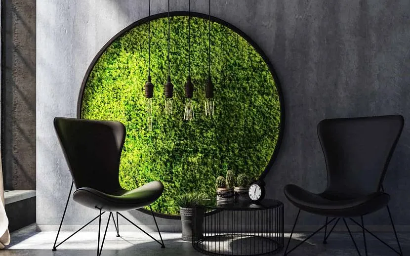 Элементы фитодизайна, пришедшие из Европы, активно завоевывают сердца владельцев самых разных помещений по всей территории СНГ. В интерьере такой материал смотрится очень стильно и органично, он приятен на ощупь. К тому же, важным фактором выбора моховой травы для декора является и отсутствие какого-либо специального ухода. Панно из стабилизированного мха, картины и целые стены могут украшать: