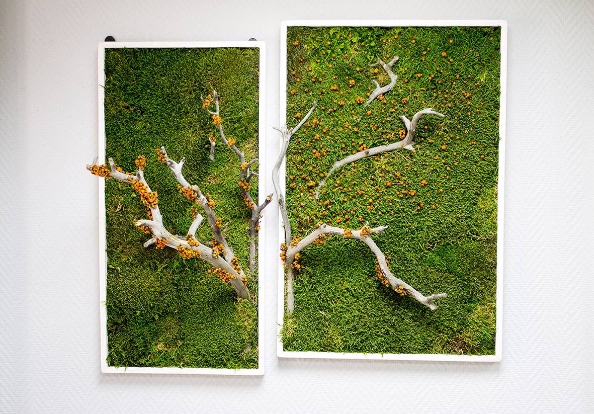 Изображение, сделанное с помощью растения и других природных элементов, выглядит стильно и эпатажно. Такая «живопись» прекрасно впишется в помещение, выполненное в экостиле. Картины изо мха можно использовать в качестве альтернативы живой стене. Впервые такое искусство появилось в Японии. Местные умельцы «выращивают» картины из настоящих растений, а потом продают их. «Полотна» создают эффект присутствия на природе и способствует медитации.