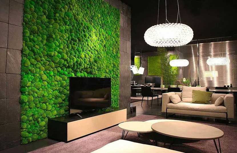 Просторные помещения идеальны для размещения объемных фитопанелей. Примерами удачного оформления гостиной являются: