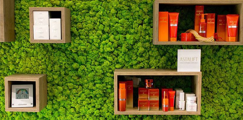 Так как за живым мхом в интерьере довольно сложно ухаживать, дизайнеры в своей работе чаще всего выбирают стабилизированное растение, вся жидкость которого заменяется на специальный раствор на основе глицерина.