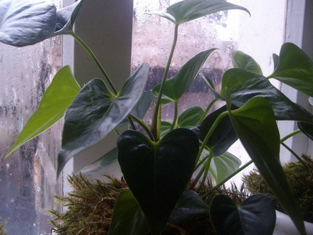 - Темные пятна на листьях появляются в том случае, если цветок находиться на протяжении длительного периода в помещении с низкой температурой. Достаточно лишь поместить антуриум в теплом помещении и уменьшить полив
