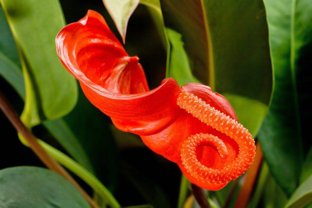 - Антуриум Шерцера отличается извитым початком соцветия. Из-за такой формы при искусственном разведении его опыляют вручную. Множество гибридов этого вида имеют самые необычные формы и оттенки.