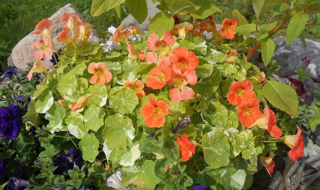 Настурцию можно сочетать с другими растениями – разновидностями герани, шалфея, петуньи и розмарина. Голубоватые, синие и фиолетовые цветы прекрасно подчеркнут тёплые оттенки настурции.